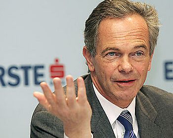 Der Generaldirektor der Erste Bank Andreas Treichl praesentiert am Freitag, 29. Feb. 2008 bei einer Bilanzpressekonferenz in Wien die Geschaeftszahlen fuer das Jahr 2008. (AP Photo/Ronald Zak) – Director General of the Austrian Erste Bank Andreas Treichl speaks at a news conference in Vienna, on Friday, Feb. 29, 2008. (AP Photo/Ronald Zak)
