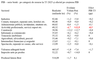 Activități profesionale și serviciile suport (-4,7% rezultat în volum și +11,9% indice de preț) au venit cu cea mai mare influență negativă pe avansul PIB în T3 2025 (-0,5 puncte procentuale). Marginal, a mai contat și scăderea din administrație publică, învățământ, sănătate etc. (-0,4% volum și +1,5% indice de preț), însă aceasta a fost utilă pentru ajustarea fiscală în curs.