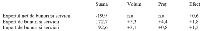 Evoluție favorabilă, dezechilibrul din schimburile externe a scăzut sub pragul de 20 miliarde lei, în contextul unei creșteri cu 5,3% a exporturilor (la prețuri mai mari cu 4,4%), sensibil peste cea importurilor (+3,1%, la prețuri doar cu pușin mai mari, +0,8%). A rezultat un sold net negativ ameliorat cu 10 miliarde lei, care reflectă o reorientare a motoarelor de creștere către piața externă.
