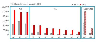 Studiul arată că averea financiară pe cap de locuitor a crescut de aproape cinci ori în ultimii douăzeci de ani în Europa Centrală și de Est, pe măsură ce economiile regiunii se apropie progresiv de cele din Europa de Vest. Comparativ, în țările din Europa de Vest, precum Germania, Italia și Austria vorbim doar de o dublare a acestui indicator. „Cu toate acestea, averea financiară pe cap de locuitor în Europa Centrală și de Est rămâne în jur de 30% din nivelul din Europa de Vest, ceea ce sugerează că există posibilitatea unei convergențe suplimentare semnificative.”, spune Mauro Giorgio Marrano, economist senior în Europa Centrală și de Est și unul dintre autorii studiului.