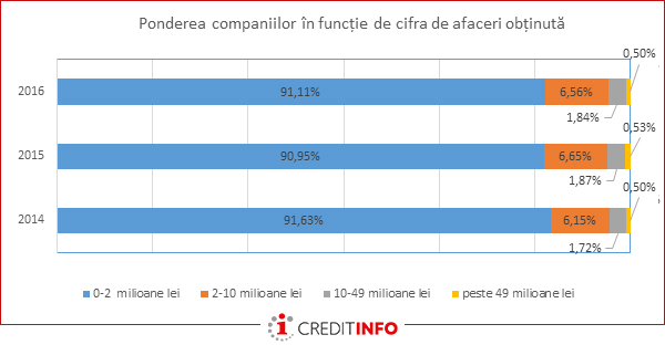 Totul, în contextul în care numărul companiilor înregistrate în România care au desfășurat activitate a crescut cu 19.000 față de anul precedent, ajungând la 556.000, față de 537.000 în 2015. A scăzut în schimb cifra de afaceri, de la 1,2 mii de miliarde lei în anul 2015 la 1,195 mii de miliarde lei în anul 2016, se mai arată în studiul Creditinfo. Ponderea companiilor care au cifre de afaceri de până la 2 milioane lei este de 91%, într-o ușoară creștere față de anii precedenți. A scăzut în schimb ponderea companiilor care au înregistrat cifre de afaceri de peste 49 de milioane lei, de la 0,53% în anul 2015 la 0,5% anul trecut.