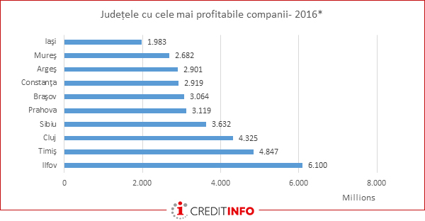 Profitul generat de companiile bucureștene, cel mai important din toată țara, a înregistrat o creștere de 4 miliarde lei în anul 2016 (34 de miliarde lei profit) față de anul precedent (profit de 30 miliarde lei). Urmează județul Ilfov, cu 6,1 miliarde lei profit în anul 2016, Timiș (profit de 4,8 miliarde lei), Cluj (4,3 miliarde lei), Sibiu (3,6 miliarde lei), Prahova (3,1 miliarde lei), Brașov (3 miliarde lei), Constanța și Argeș (cu 2,9 miliarde lei), Mureș (2,6 miliarde lei) și Iași (1,9 miliarde lei).