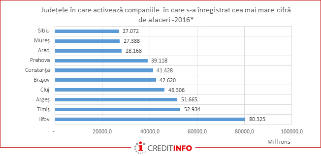 Pe județe, cele mai importante cifre de afaceri sunt generate de Ilfov (80 de miliarde lei în anul 2016, în creștere cu 12 miliarde lei față de anul precedent, când cifra de afaceri era de 78 miliarde lei), Timiș (53 miliarde lei), Argeș (51 miliarde lei), Cluj (46,3 miliarde lei), Brașov (42,6 miliarde lei), Constanța (41,4 miliarde lei), Prahova (39,1 miliarde lei), Arad(28,1 miliarde lei), Mureș (27,3 miliarde lei) și Sibiu (27 miliarde lei). De altfel, județul Sibiu este nou intrat în Top 10, luând locul județului Bihor, care iese din grupul fruntaș.