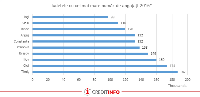 Companiile din București au și cei mai mulți angajați, chiar dacă numărul lor este în scădere (1,028 milioane în 2016 față de 1,056 milioane în 2015). În țară, cei mai mulți angajați erau, la finalul anului 2016, în companiile înregistrate în județul Timiș (187.000), Cluj (174.000), Ilfov (160.000), Brașov (149.000), Prahova (138.000), Constanța și Argeș (132.000), Bihor (120.000), Sibiu (110.000) și Iași cu 98.000 de mii salariați.