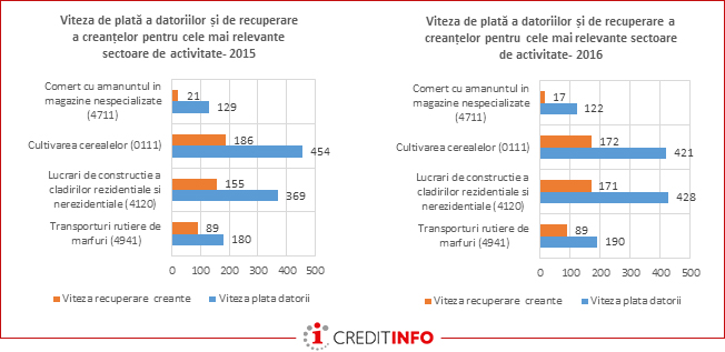 În cadrul comerțului cu amănuntul în magazine nespecializate, viteza de recuperare a creanțelor este în scădere, de la 27 zile în anul 2014, la 17 în anul 2016. Trendul este similar și pentru plata datoriilor, care în anul 2014 avea o durată de 152 zile pe când în 2016 a scăzut la 122 zile. Lucrările de construcție a rezidențialelor înregistrează valori ridicate atât pentru recuperarea creanțelor (171 zile, de la 155 în anul 2015) cât mai ales la plata datoriilor, unde după o scădere de la 470 zile (2014) la 369 zile (2015), a ajuns la 428 zile în 2016. Cultivarea cerealelor înregistrează valori ridicate atât la recuperarea creanțelor (172 zile în 2016, în scădere de la 186 zile în 2015, dar în creștere față de 161 zile în 2014) cât și pentru plata datoriilor (421 zile în anul 2016, de la 454 zile în anul 2015, dar în creștere de la 370 zile în anul 2014).