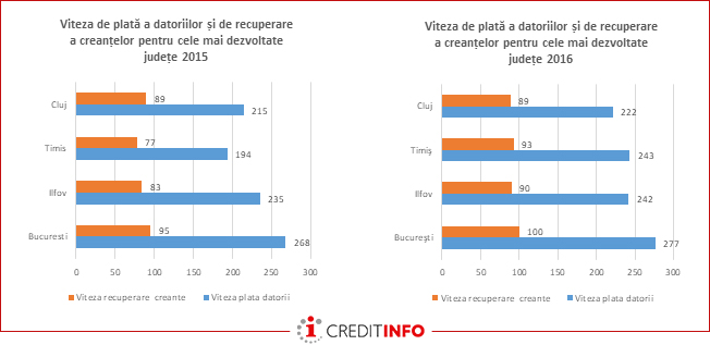 În București, viteza de recuperare a datoriilor a crescut de la 268 zile in anul 2015 la 277 zile în anul 2016. Același lucru se poate afirma și pentru durata de recuperare a creanțelor care a crescut de la 95 zile în anul 2015 la 100 zile în anul 2016. În județul Cluj, viteza de recuperare a creanțelor a rămas constantă 89 zile însă viteza de plata a datoriilor a crescut cu 7 zile, de la 215 zile în anul 2015 la 222 zile în anul 2016.