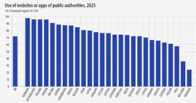 Pentru referință, menționăm că, la polul opus, s-au situat țări precum Danemarca (98% din populație a utilizat mediul electronic pentru comunicarea cu autoritățile publice), Olanda (96,2%), Finlanda (96,1%) și Suedia (96%). Media UE pe anul 2025 a fost de 71,9%, în creștere anuală cu 1,9 puncte procentuale și cu 4,3 pp față de anul 2022, când a început colectarea datelor specifice.