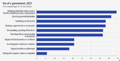 Utlizarea facilităților e-government s-a făcut în proporție de 44,2% pentru a obține informații despres servicii, legislație, orar de funcționare etc., accesarea informațiilor personale (41,3%), depunerea de declarații fiscale (38,2%), efectuarea unei rezervări sau stabilirea unei întâlniri (38,1%).