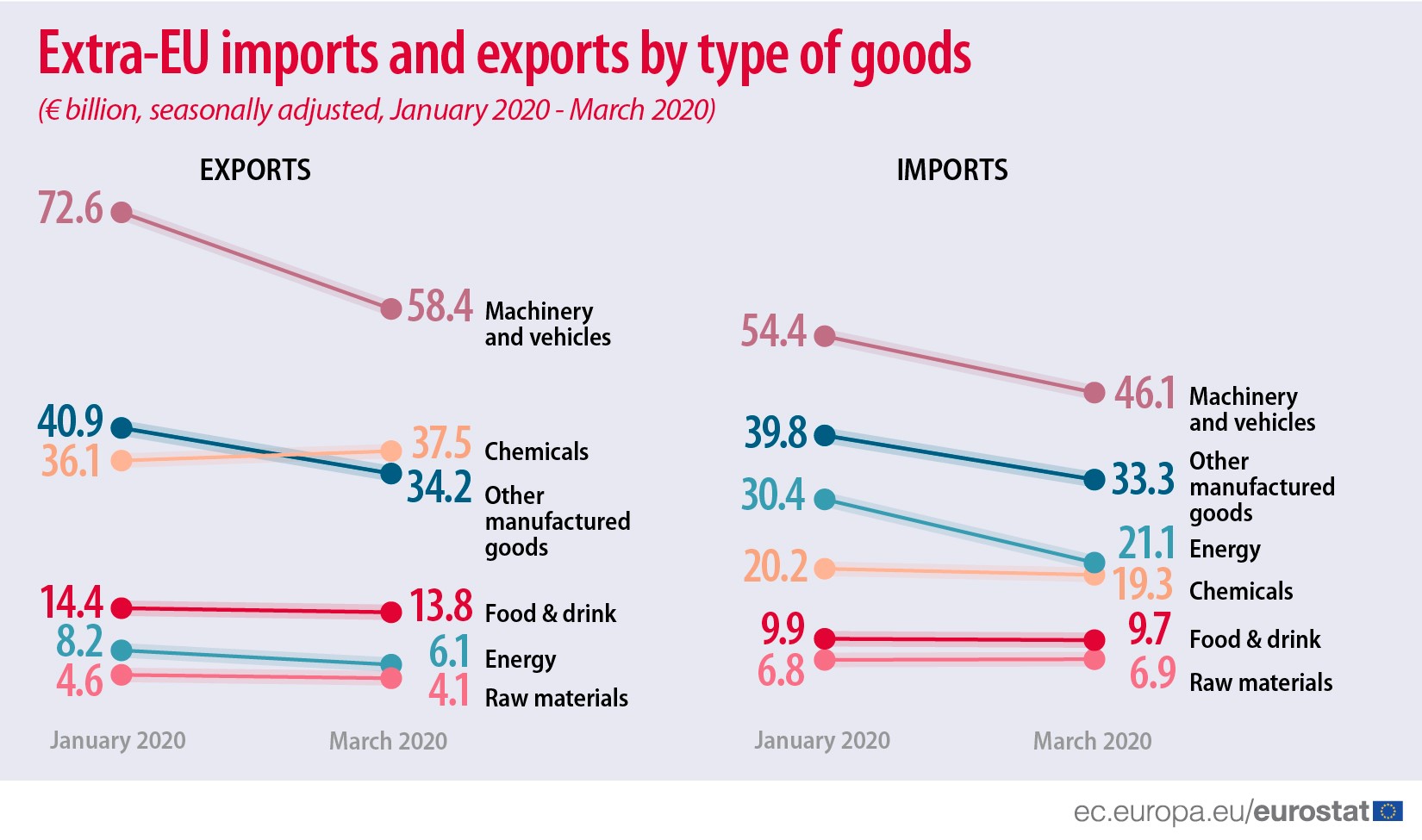 Evoluția comerțului exterior al UE27 pe grupe de bunuri (martie 2020 față de ianuarie 2020)