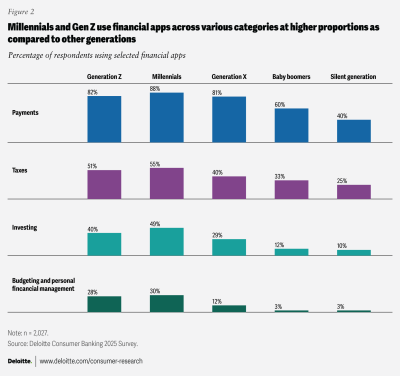 Many bank consumers use various financial apps—ranging from budgeting to taxes and investing—to manage their financial lives. Figure 2 shows how deeply both surveyed millennials and Gen Z depend on financial apps. In most categories, millennials lead in usage, but Gen Z respondents track closely behind, except for payments, where Gen X, millennial, and Gen Z respondents exhibit a similar level of preference.