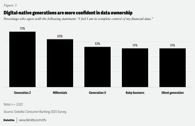 Younger consumers in the survey seem to feel more in control of and are more willing to share financial data