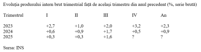 Recalcularea datelor prezentate anterior a adus ușoare modificări diminuare ale rezultatului brut pe parcursul ultimilor trei ani, în care tendința a fost de reducere a avansului economic în termeni reali (de la +2,3% în 2023, la +0,9% în 2024 și +0,8% pe primele trei trimestre din anul curent).
