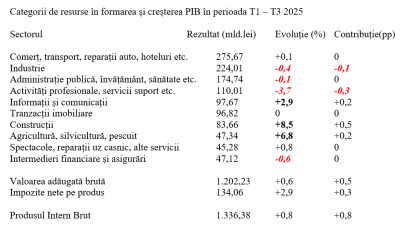 Din perspectiva contribuției categoriilor de resurse la creșterea economică pe primele trei trimestre ale anului, se remarcă reculul semnificativ pe segmentul de activități profesionale, servicii suport etc. (-3,7% indice de volum, de unde o influență negativă de -0,3 puncte procentuale pe evoluția PIB. Din păcate, industria și-a continuat declinul cronic (-0,4% realizări) și a adăugat -0,1pp la PIB.
