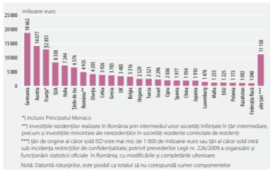 Repartizarea ISD în funcție de țara investitorului final (țara de rezidență a entității aflate în vârful lanțului de proprietate din cadrul unui grup de societăți, care nu este controlată de nicio altă entitate – ”Ultimate Investing Country”), indică Germania, direct sau prin intermediul unor filiale din țări intermediare, pe prima poziție în rândul țărilor care au investit în România.