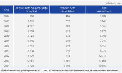 În ceea ce privește veniturile obținute din ISD, acestea s-au situat în 2024 la 10.899 milioane €, valoare mai mică față de anul precedent (-8,1%), după (-6,7% în 2023 față de 2022). Veniturile nete obținute din paticipații la capitalurile proprii au însumat 9.708 milioane € (-9,8%, după -10,3% anterior), în timp ce diferența de 1.192 milioane euro a provenit din dobânzi („doar” +8,3%, după +53,5% anterior), susținute de creșterea ratelor dobânzilor.