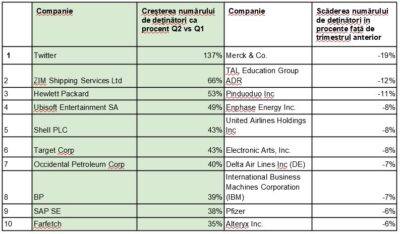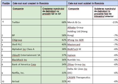 eToro a analizat companiile care au înregistrat cea mai mare creștere sau scădere proporțională a deținătorilor de acțiuni la sfârșitul celui de-al doilea trimestru față de sfârșitul primului trimestru. Două companii aeriene se află în topul primelor 10 companii care au înregistrat scăderi – United Airlines Holdings (-8%) și Delta Air Lines (-7%), în timp ce două companii farmaceutice importante sunt, de asemenea, prezente în top – compania americană Merck & Co scăzând cu 19% la nivel global și cu 21% în România. urmată de Pfizer (-6%).