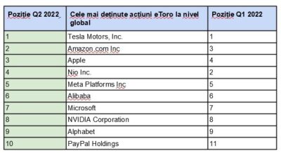 Datele din primul tabel arată cele 20 de acțiuni care au înregistrat cea mai mare creștere și respectiv scădere proporțională a numărului de deținători pe platforma eToro de la un trimestru la altul (T1 vs T2), iar tabelul trei se referă la România. Datele din cel de-al doilea tabel arată primele 10 cele mai multe poziții de acțiuni deținute (poziții deschise) de către investitorii globali pe platforma eToro la sfârșitul celui de-al doilea trimestru din 2022, iar datele din tabelul patru se referă la România. Deoarece marea majoritate a acțiunilor tranzacționate pe eToro sunt active reale, aceste date nu includ pozițiile deținute sub formă de CFD-uri. Date exacte la 1 iulie 2022.