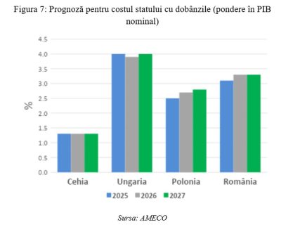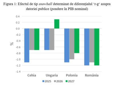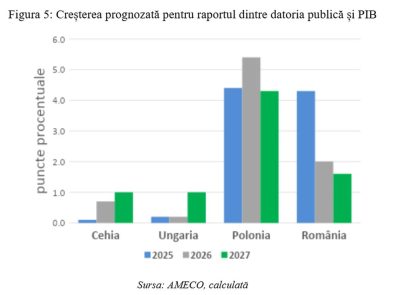 Date fiind circumstanțele menționate anterior, pentru România, se așteaptă o creștere a raportului datorie publică / PIB de 2 și, respectiv, 1,6 puncte procentuale în anii 2026 și 2027, în timp ce pentru Cehia și Ungaria, creșterile așteptate sunt de până la 1 punct procentual.