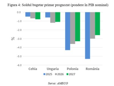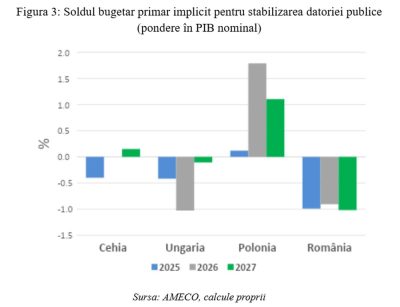 În schimb, în opoziție cu rezultatele calculelor de mai sus disponibile în baza de date AMECO, deficitele bugetare primare prognozate pentru 2026-2027 depășesc semnificativ nivelul de 1% în cazul țării noastre. În cazul Poloniei, pentru care ar fi trebuit să existe excedente bugetare primare în vederea stabilizării datoriei publice pentru 2026 și 2027, se așteaptă deficite bugetare primare în următorii doi ani chiar mai mari decât ale României, ceea ce va determina, și pentru această țară, o creștere semnificativă a datoriei publice.