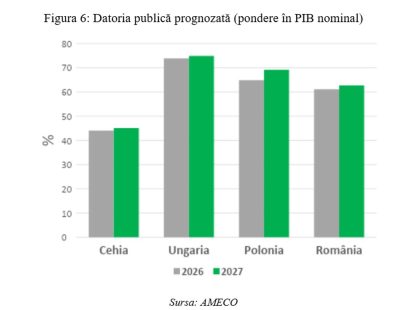În aceste condiții, se așteaptă ca datoria publică a României să ajungă aproximativ 61,1% din PIB în 2026 și 62,7% din PIB în 2027, în timp ce pentru Polonia se așteaptă niveluri de 64,9% și, respectiv, de 69,2%. Ungaria va avea în continuare cea mai mare datorie publică din regiune, care va atinge nivelul de 73,9% și, respectiv, 74,9% în intervalul de timp menționat (conform informațiilor furnizate de AMECO).