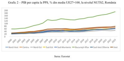 În același timp, polarizarea regională s-a accentuat. București-Ilfov, cu PIB pe locuitor în PPS reprezentând 190% din media UE (UE27 = 100) în 2023 este astăzi una dintre cele mai bogate regiuni din Europa, depășind Varșovia sau Budapesta. La polul opus, regiunile de sud și est rămân sub media europeană. Decalajul intern evidențiază două viteze de dezvoltare – un nucleu dinamic în jurul Capitalei și regiuni care avansează mult mai lent – și reflectă diferențe majore în structura economiei, productivitate și investiții.