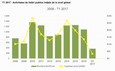 Activitatea de listări publice iniţiale de la nivel global (IPO) a avut parte de un start promițător în primul trimestru al anului 2017, datorat în mare parte câștigurilor obținute pe piața Asia-Pacific și faptului că SUA au găzduit primele două megatranzacții ale anului. În primele trei luni ale anului, cele 369 de oferte publice au atras 33,7 miliarde de USD, marcând o creștere de 92% a numărului de IPO-uri și de 146% a capitalului atras, comparativ cu aceeași perioadă a anului trecut. În plus, primul trimestru din 2017 a înregistrat cea mai intensă activitate de la nivel global din ultimii zece ani, în privința numărului de IPO-uri, arată raportul trimestrial EY Global IPO Trends: Q1 2017.