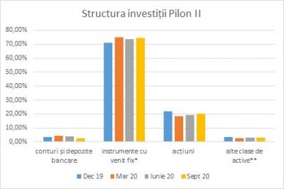 Pe măsură ce piața de capital a consemnat reveniri, având în vedere sentimentul pozitiv cu privire la economiile sprijinite puternic prin programe de relaxare fiscală și monetară, expunerea pe titluri de stat și depozite s-a diminuat la nivelul de 76,98% (septembrie 2020), fără modificări notabile. Această situație de fapt are în vedere atât performanțele bune ale bursei, realizate în perioada iunie – septembrie, cât și revenirea activelor la valori apropiate de cele înregistrate înainte de izbucnirea pandemiei.
