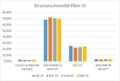 În ceea ce privește Pilonul III de pensii private, structura investițiilor este dominată de conturi curente, depozite și titluri cu venit fix în proporție de 72,42% la septembrie 2020 (ușoară creștere față de nivelul de 71,06% raportat la decembrie 2019). Cea mai mare alocare către această expunere s-a înregistrat în martie 2020, respectiv 74,38%, rebalansare generată de turbulențele și volatilităţile ridicate de pe piața acțiunilor și mărfurilor.