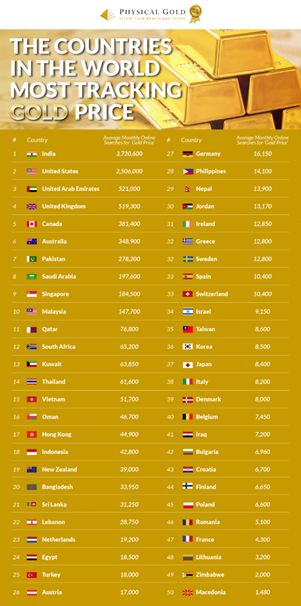 - India is the country most curious about gold price, as there are an average 3,720,600 online searches per month from Indians tracking the price of gold online,