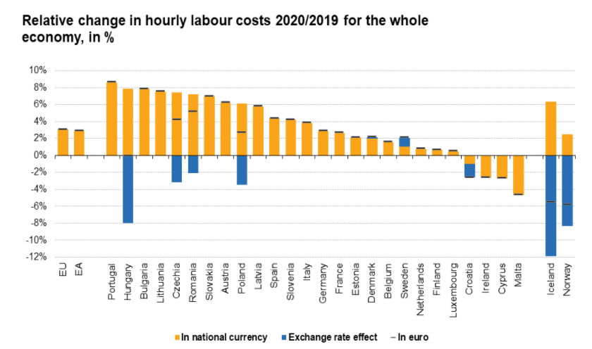 Modificarea costului orar al muncii între 2019 și 2020 (%)