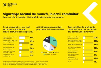 Piața muncii din România rămâne una în care vârsta poate fi atât un atu, cât și un obstacol. Conform studiului realizat de Raiffeisen Bank în parteneriat cu Appinio, mulți angajați resimt efectul vârstei asupra șanselor de angajare. Riscul de a fi concediați din această cauză este menționat de 2 din 10 respondenți. Evoluția inteligenței artificiale și a tehnologiei sunt, de asemenea, motive de îngrijorare pentru 30% dintre români, aceștia așteptându-se ca forța de lucru umană să fie înlocuită de către inteligența artificială sau prin automatizarea anumitor locuri de muncă. Cele mai mari temeri rămân, însă, scăderea salariilor (54% dintre răspunsuri) și pierderea locului de muncă (49%), determinate de situația economică actuală, urmate de impactul evoluției tehnologice.